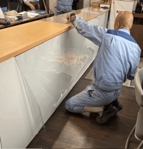受付カウンターに掲示物を掲示していますが、気づけば掲示物が破れたり、ペロンと折れてしまったり見た目もよくないということで、透明のビニールシートできれいなまま維持できるように作業長より改善提案があり、自ら工具を使って改善していただきました☆彡